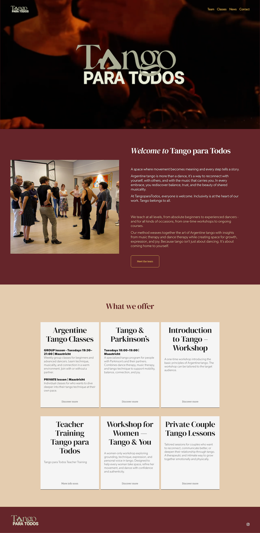 Fun project for TangoParaTodos: the organisation sought a refreshed visual identity, including a new logo. With a wide range of services to represent, the challenge was to design a website that presents everything clearly without feeling cluttered. We focused on a clean, balanced layout, coherent typography and a colour palette that supports both energy and calm. The result is an accessible, elegant site that communicates TangoParaTodos’ offerings at a glance while preserving warmth and personality across pages and touchpoints.